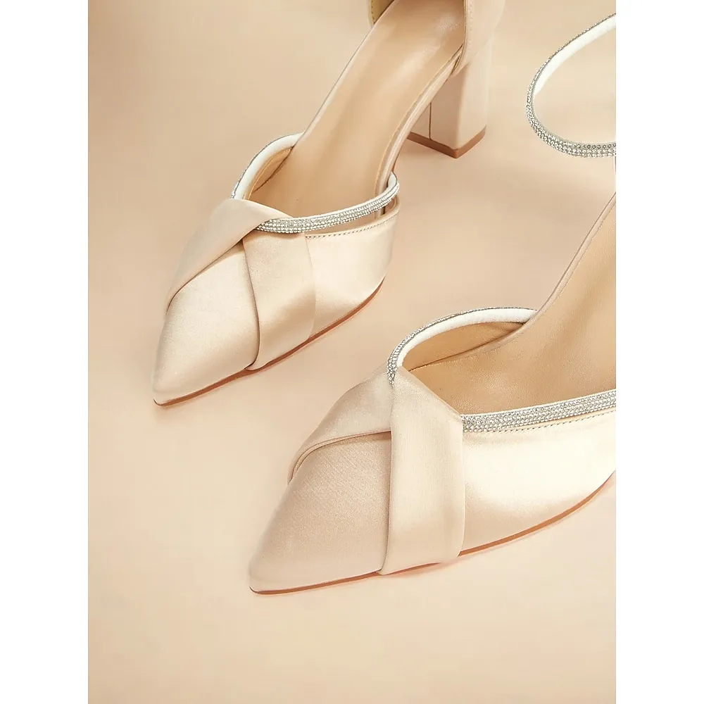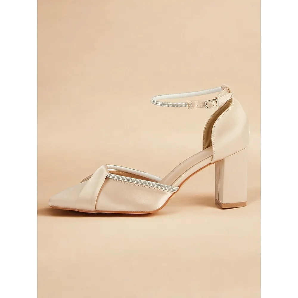 Champagne Satin Block Heel Ankle Strap Shoes with Rhinestone Detailing – Elegant Women’s Wedding and Evening Heels