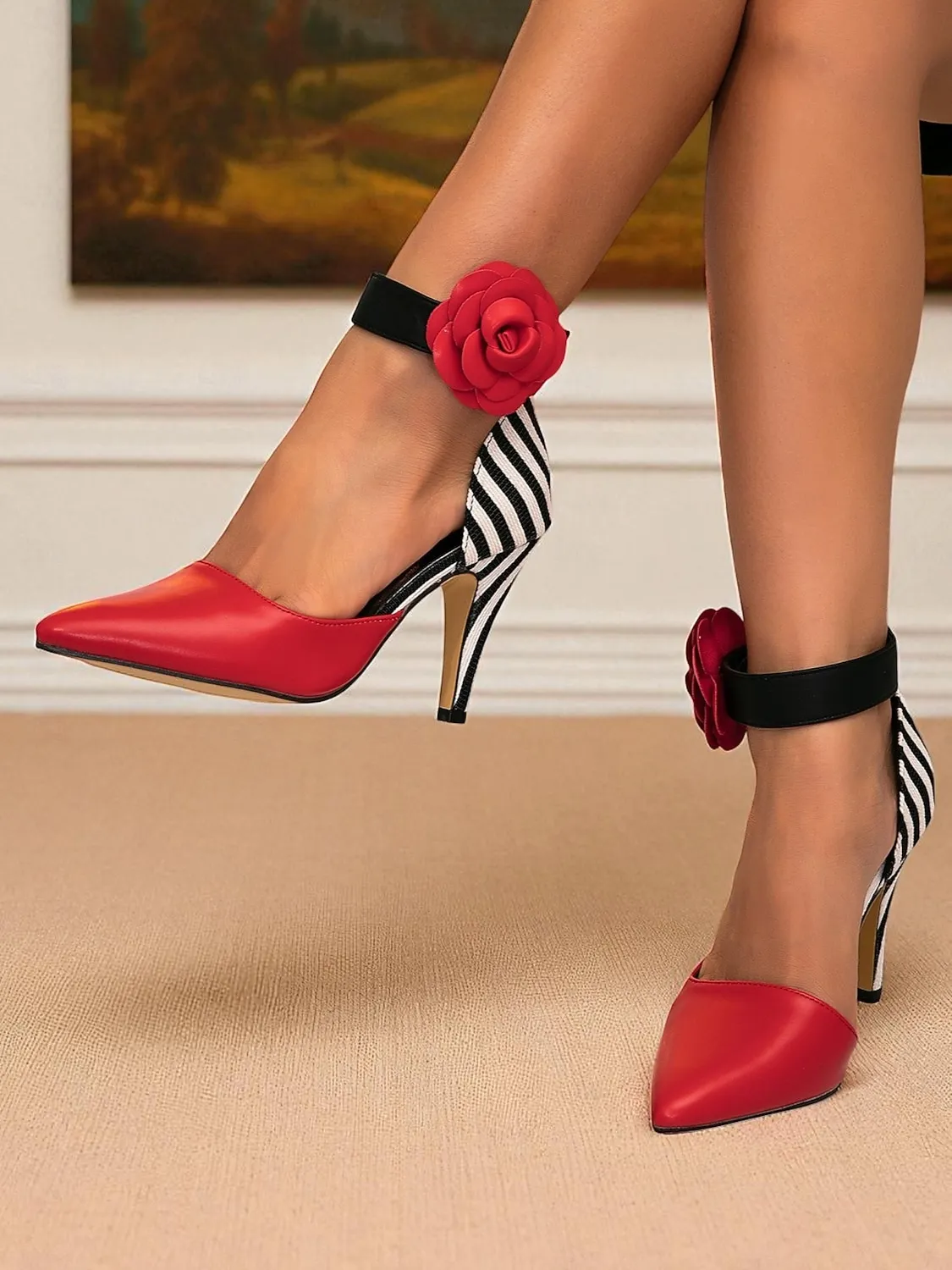 Women’s 1950s-Inspired Striped Stiletto Heels with Red Rose Ankle Strap – Retro Pointed Toe Pumps for Parties, Performances & Date Nights