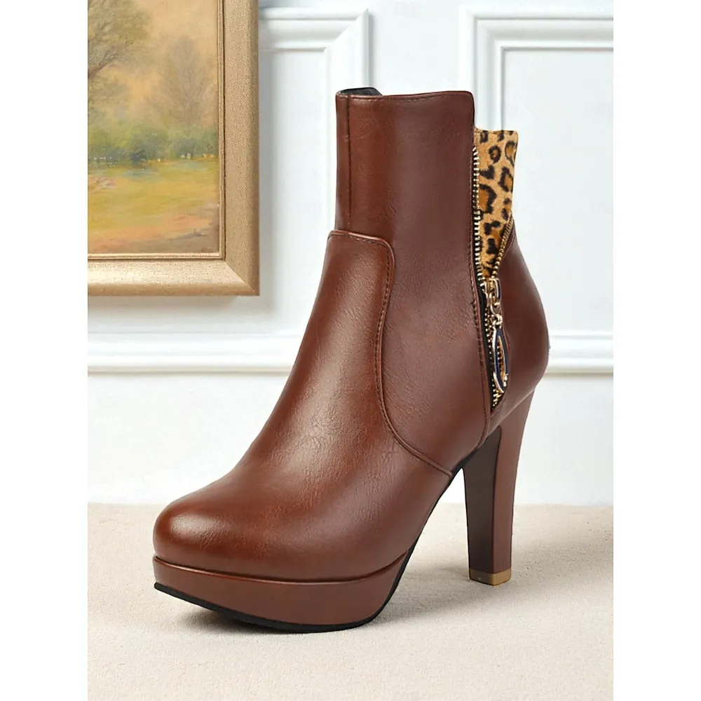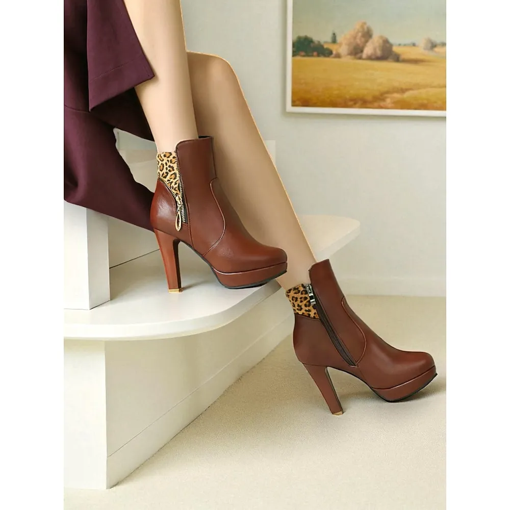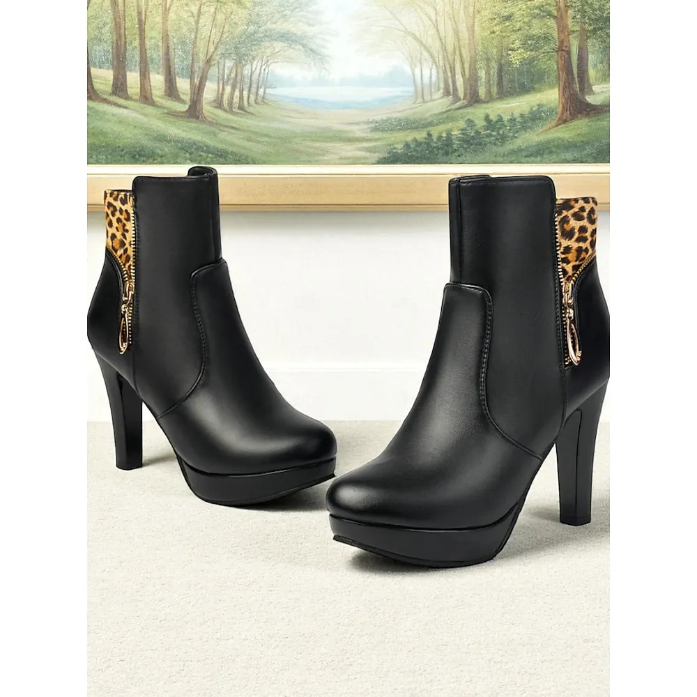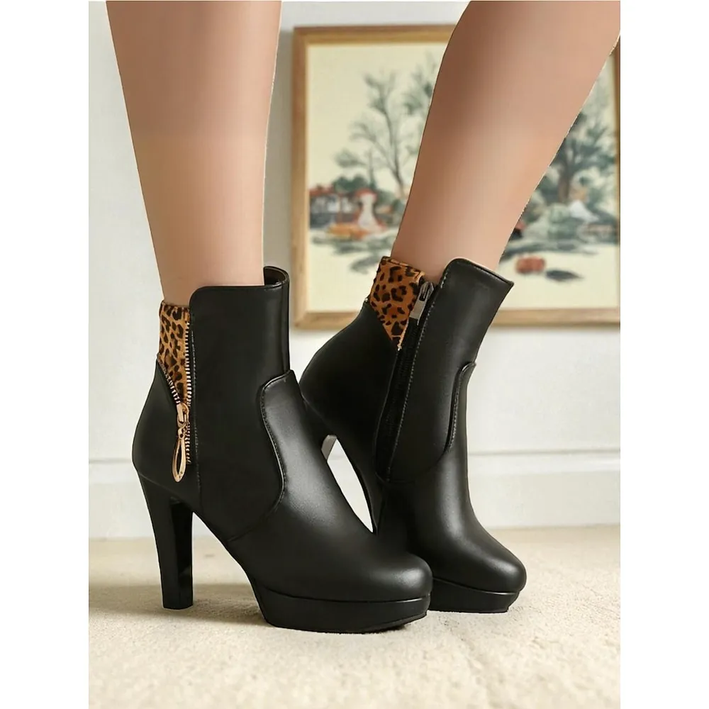 Women’s Black High Heel Ankle Boots with Leopard Print Cuff and Side Zipper, Elegant Platform Booties for Parties, Nightclub & Casual Chic Outfits