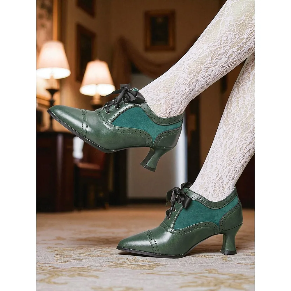 Women’s Edwardian Era Green Oxford Heels – 1900s-1910s Vintage Lace-Up Victorian Mid-Heel Dress Shoes with Brogue Detailing, Perfect for Tea Parties, Cosplay and Historical Events