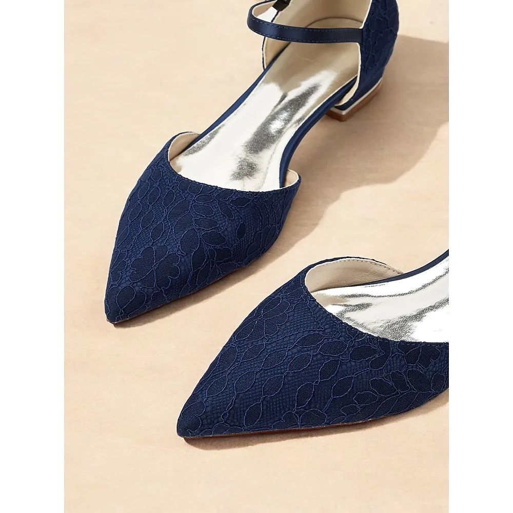 Women’s Navy Blue Lace Flats with Ankle Strap and Pointed Toe – Elegant Wedding and Evening Shoes