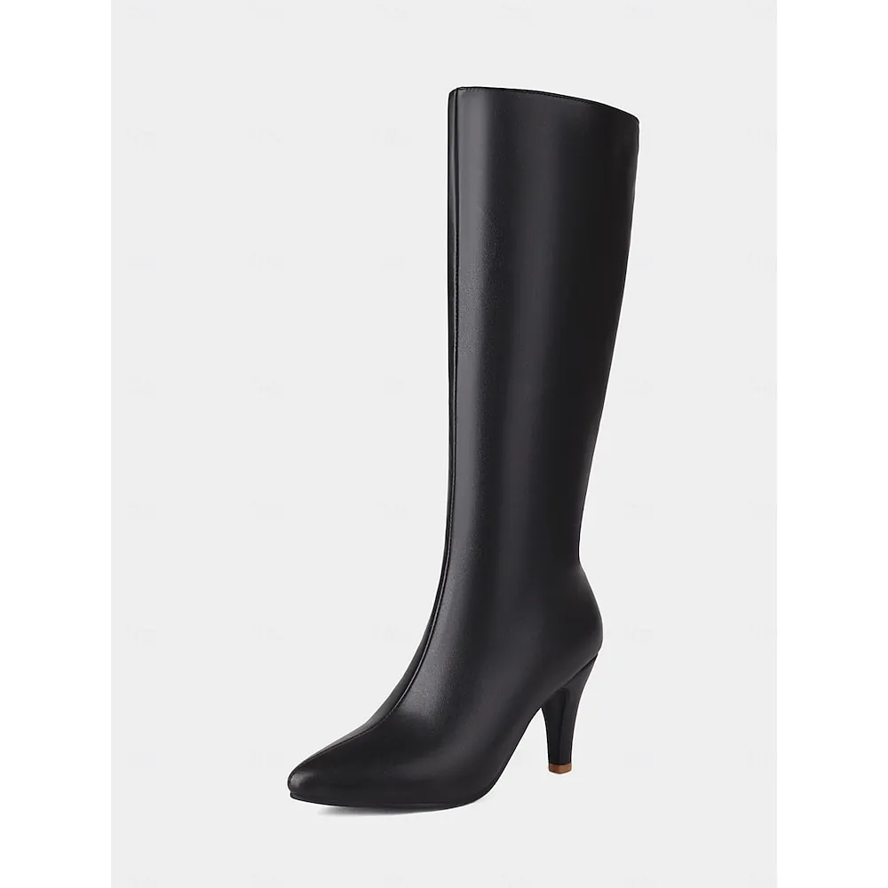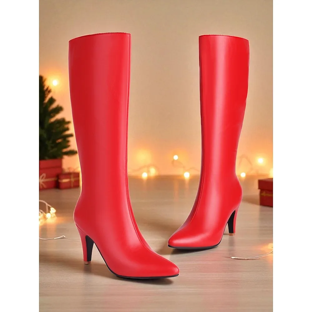 Women’s Red Knee High Stiletto Heel Boots – Faux Leather Pointed Toe Party Footwear for Nightlife & Christmas Holiday Celebrations