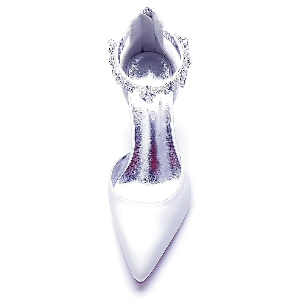 Women’s Silver Satin Pointed-Toe Wedding Heels – Rhinestone Embellished Ankle Strap and Elegant Mid Heel