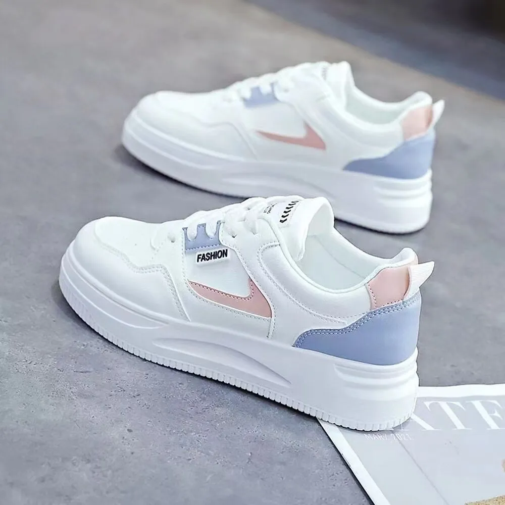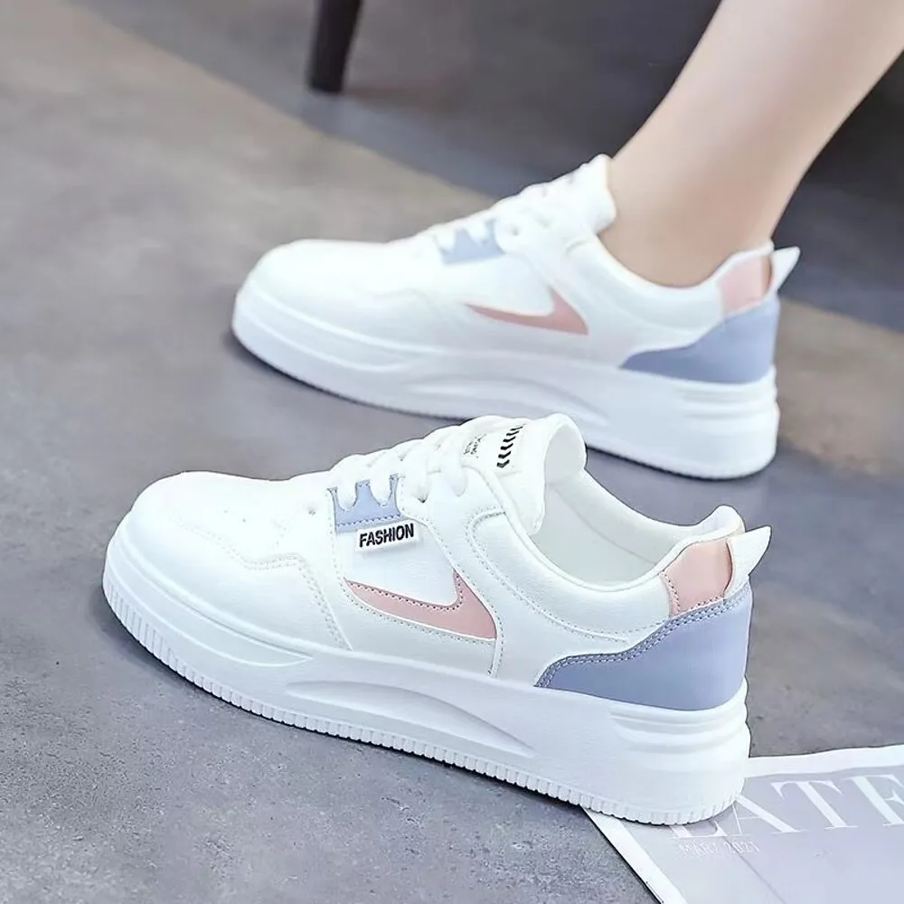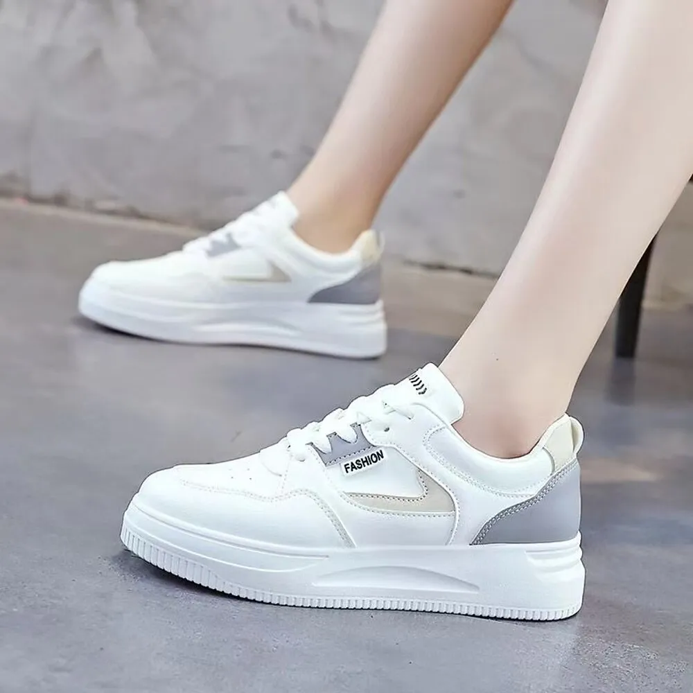 [Fabric and Material] These women’s sneakers are crafted from high-quality faux leather, offering both durability and a smooth, polished look. The material’s sleek finish adds an element of sophistication to the overall design.[Style and Fit] Featuring a modern platform heel, these sneakers exhibit a sporty, casual style that is both trendy and functional. The lace-up closure ensures an adjustable and secure fit, making them suitable for different foot shapes.[Design Highlights] The sneakers are designed with a low-top silhouette and embellished with subtle gray or blue accents to create a chic contrast against the predominant white color. The cushioned rubber outsole provides superior traction and support, making these shoes perfect for everyday wear.[Occasions] These versatile sneakers are ideal for a range of activities, from casual walks to light sporting events and daily outdoor errands. Their ability to complement various outfits makes them a perfect choice for both casual outings and slightly more active days.[Size Range and Suggestions] Available in a range of sizes from US6 to US8.5, it is recommended to select your usual size for the best fit. The standard sizing ensures a comfortable wear, accommodating a wide array of foot sizes.OK